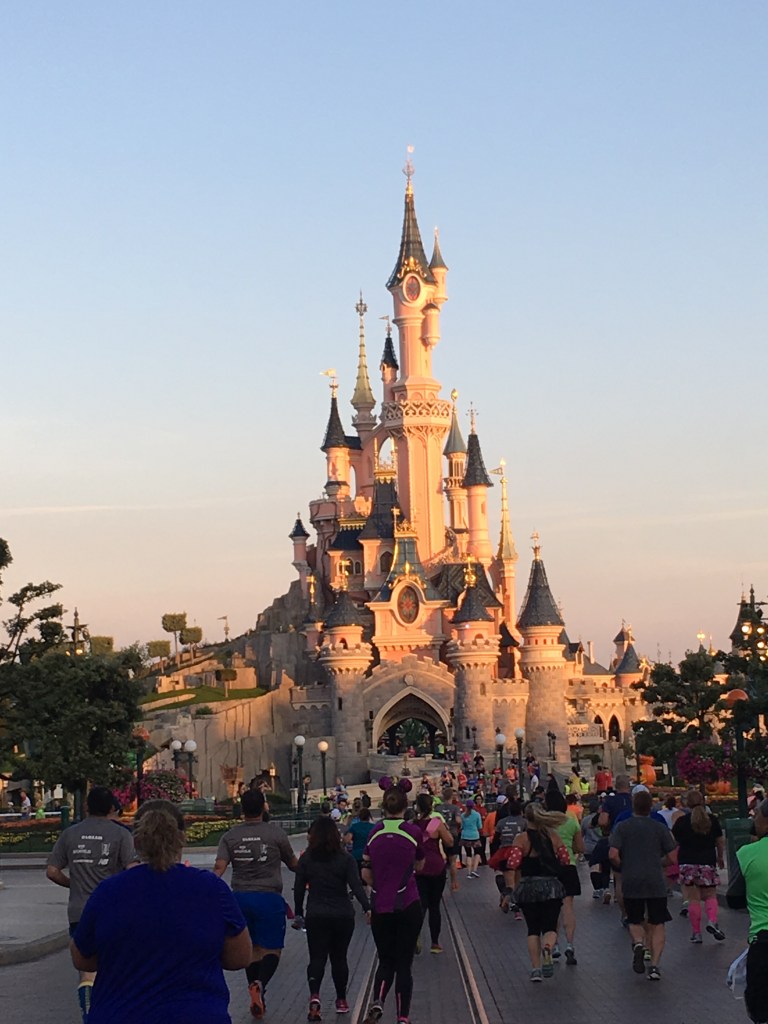 Our bags took quite awhile to get unloaded, and I am pretty sure mine and Sandra’s were the last 2 taken off the plane. Once we got our luggage, we had to find where to get on the train that takes us directly to DLP (Disneyland Paris). After a long flight, we were thankful for a very short train ride. Once we found our hotel (it was confusing), we dropped off our bags and went in search of our other roomies, Karyn and Ian. We found them in line for the expo to open. One thing to know about Disney races, they all have expos, and its the best place to buy race merch…usually. Because of the laws in France, it was very hard for the American companies to have booths at the expo. Therefore, this expo was quite small. But it was a fun experience. After dinner, we all went to bed. We were pretty beat from the long flights there.