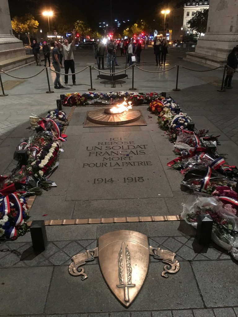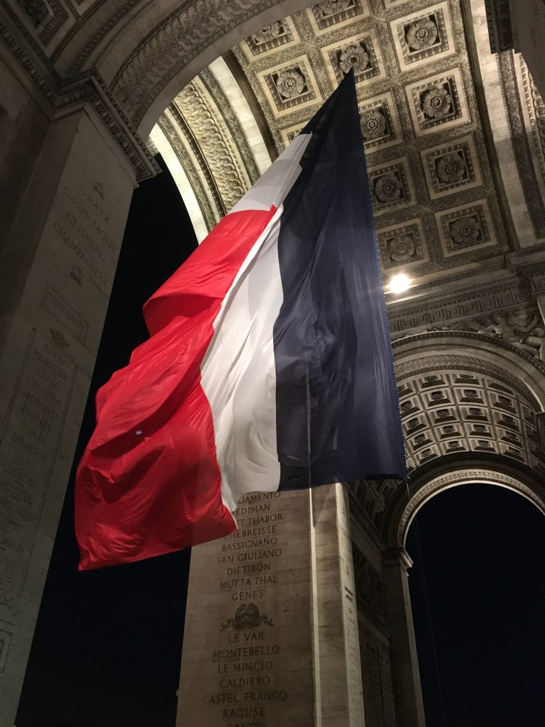Under the Arc is the Tomb of the Unknown Soldier along with a very large French flag.