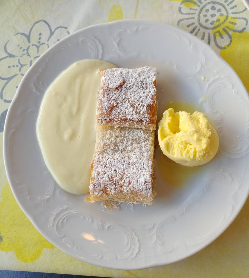 While the Von Trapps didn’t get married in the abbey, they used it for the other parts of the movie. They got married in this church in Mondsee. Hollywood used wide angle lenses to make the church look bigger than it is. (2nd pic is the outside, 3rd pic is from the inside). Another item on my “must try” list was apple strudel. As luck would have it, the location of the best apple strudel is at a cafe just outside the church. The server asked if we wanted cream (like a vanilla custard) or ice cream. We couldn’t decide, so she brought us both.